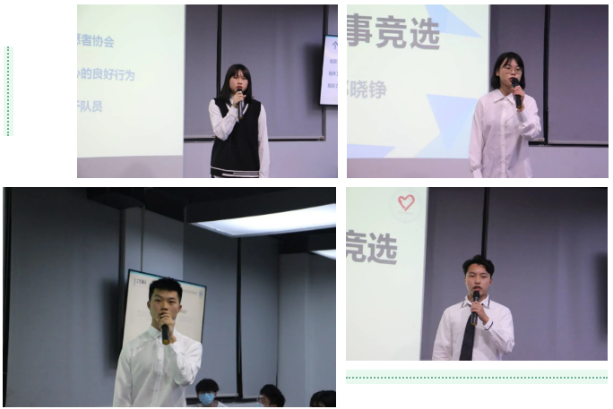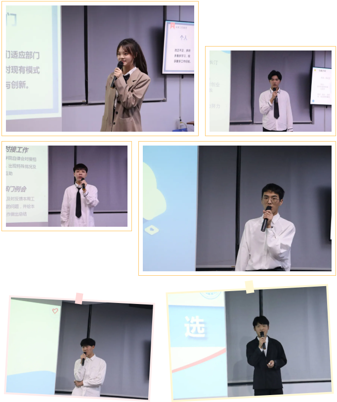 接下来是干事们的评选,他们面对这样的大场合,依旧保持着自信的微笑,从容自得的进行演讲,面对评委老师的提问也能够镇定的回答。