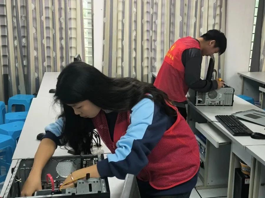 公司义务维修志愿服务队在机房管理员的指导下,对公司机房进行维护,志愿者们依次检查对部分电脑进行系统重装、主机清灰、系统优化加速与擦洗键盘、鼠标,保证机房的正常上课环境,为同学们创造良好的学习环境。
