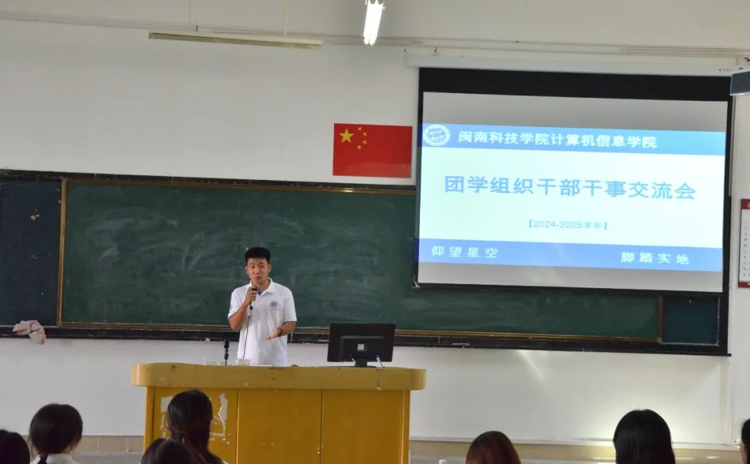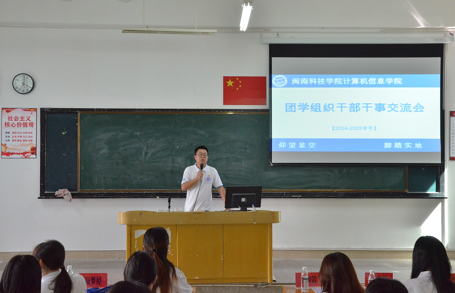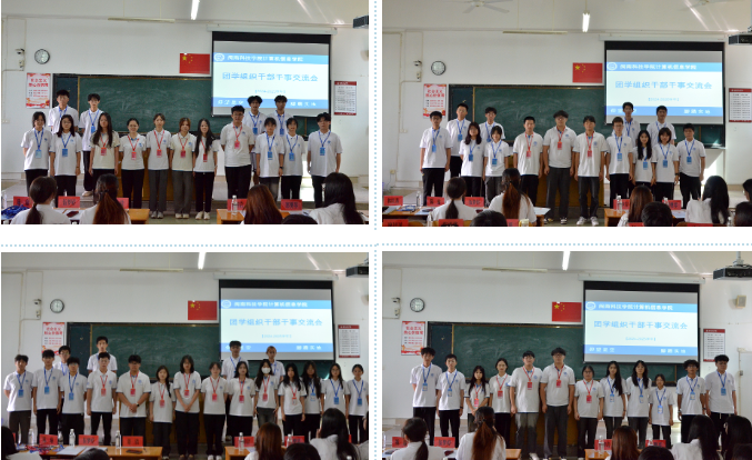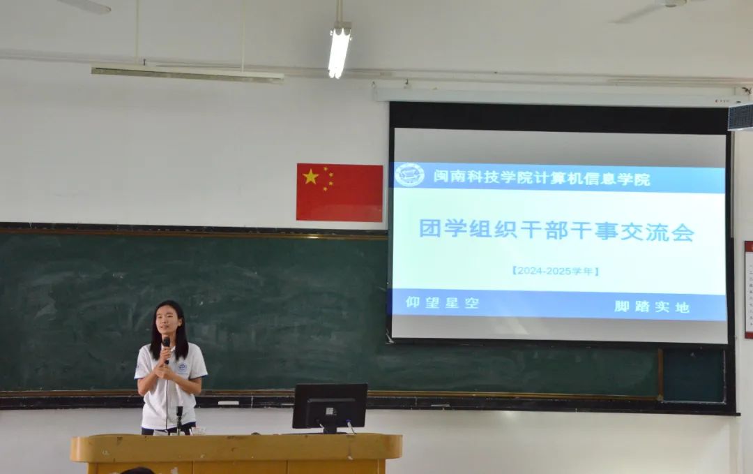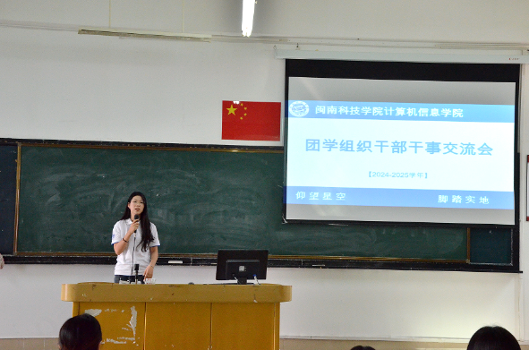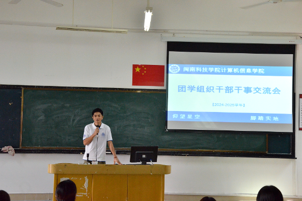 上一届团学干部上台进行演讲,分享他们的团学工作经历,勉励新一届团学干部们要够拿出自己的勇气和担当,怀有赤诚之心,保持热爱,不断追寻,让“聚是一团火,散作满天星”的计信团学精神薪火相传。