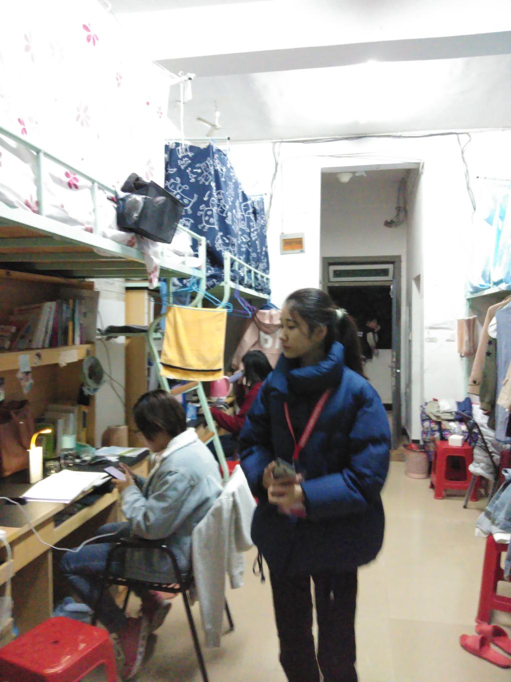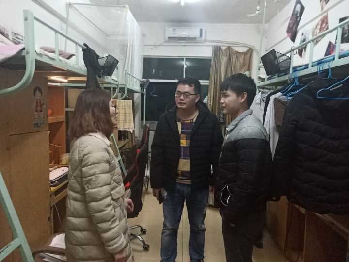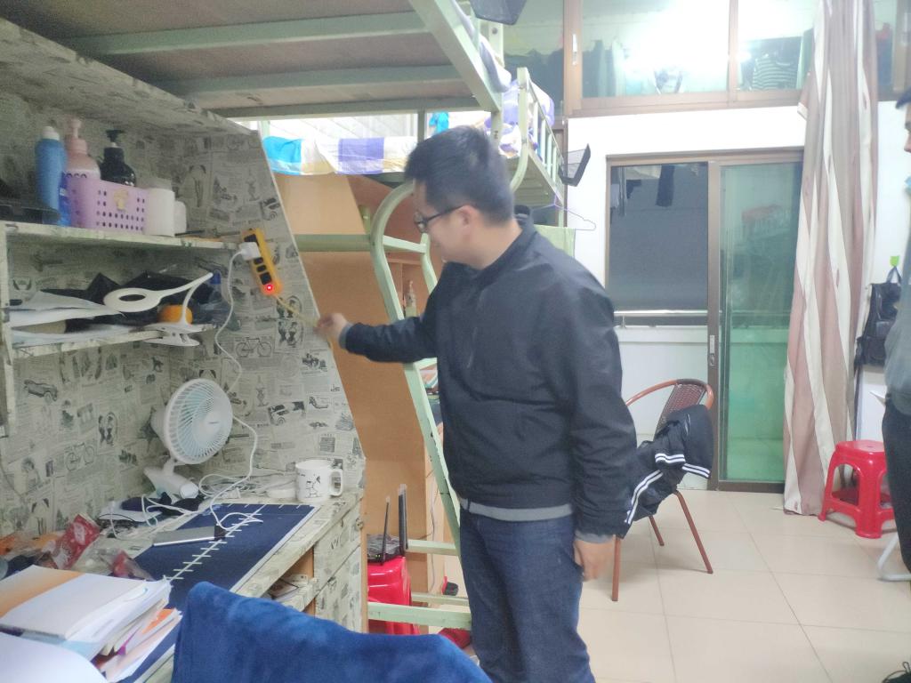 在员工宿舍,辅导员认真检查各个宿舍的电线,排插情况,同员工自律委员会的同学们一起关心同学们宿舍用电安全问题。在检查卫生的同时,辅导员还督促他们要做好期末复习准备,提前制定好复习计划,提醒他们不要沉迷于游戏。