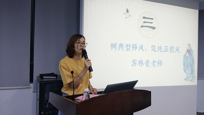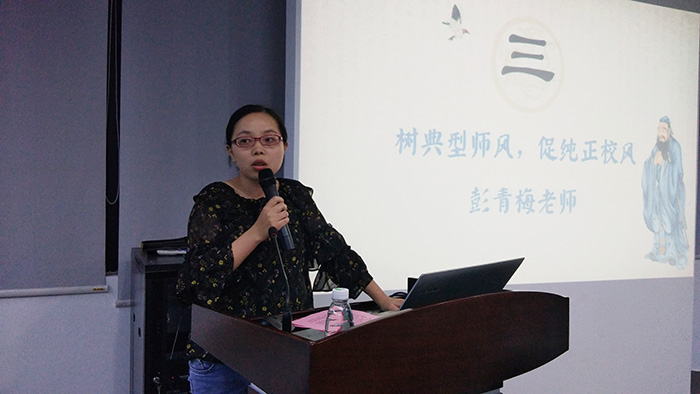 随后,两位教师代表在“谈一席感悟”环节中和大家分享了自己的感悟,她们认为作为一名高校教师,要积极响应中央的号召,时刻不忘教师职责,自觉遵守党的纪律,立足于自己的本职工作,教书育人。在接下来的“诵一段经典”环节中,大家一起朗诵《师说》中的经典片段,感受中华文化带给我们的启迪。
