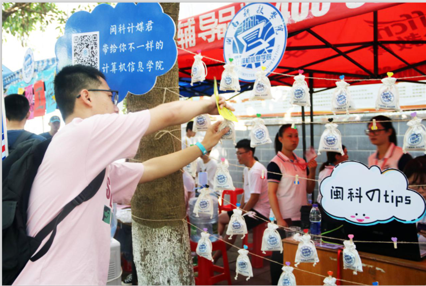 在PA视讯集团官方网站团委迎新的帐篷外,用绳子串联起来的小福袋迎风飘扬。PA视讯集团官方网站2019级的新生们前来报到并一个个随机挑选了福袋,福袋里有学长学姐的暖心寄语,也有意外的小惊喜。吴佳怡是2019级PA视讯集团官方网站智能科学与技术专业的新生,她领取到了自己的小福袋。看了学长学姐的寄语后,她笑着说:“闽科很小,但是学长学姐给予的温暖却很大。”在一张张信纸上,有可爱的人物简笔画,有学长学姐对新生的期待和祝福。“我们一共准备了200多个‘家书’,希望让新生感受到这里是他们的新家。”2017级计算机科学与技术专业的魏嫔说。