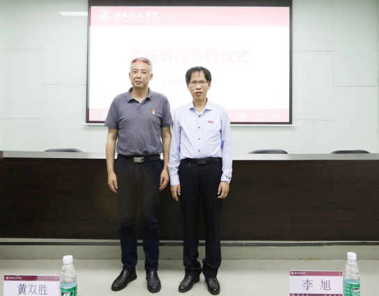 敦聘仪式上,董事长游小波为黄双胜高工颁发聘书,公司党委书记李旭为黄双胜高工佩戴校徽。