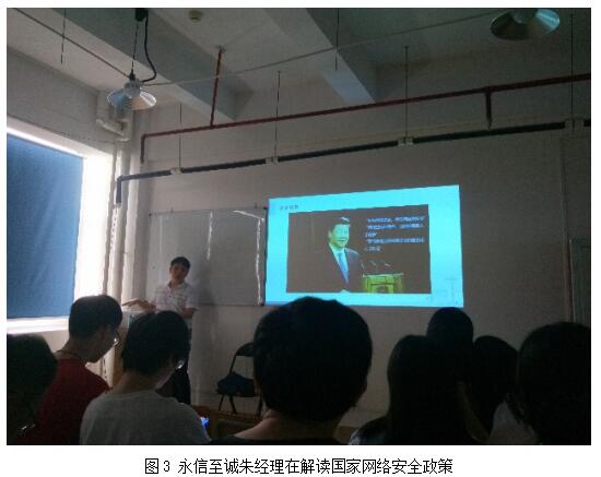 永信至诚员工通过播放永信至诚公司MV,让员工了解了永信至诚的发展历程和企业文化,并围绕网络应用现状、当前网络人才需求和技术要求等方面讲解了永信至诚公司的用人需求、用人标准和薪资福利,向员工重点强调了进永信至诚这样的厂商需要具备的能力素质要求。通过播放宣传短片让员工明白“找工作不相信眼泪”,让计科和网工员工了解了网络工程师获取HCIA、HCIP、HCIE以及H3CNE和H3CSE等证书的必要性,也让对软件开发感兴趣的员工了解到项目经验的重要性。最后,永信至诚朱锦旻安全总监对计科和网工这两个专业的员工作了老员工职业规划。