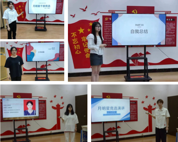 参加评选的干部干事们通过PPT展现自己在过去一个月中部门的工作历程,并结合自身经历分享自己在团员工活中的收获与成长。在演讲结束后,有条不紊地回答评委提出的问题。