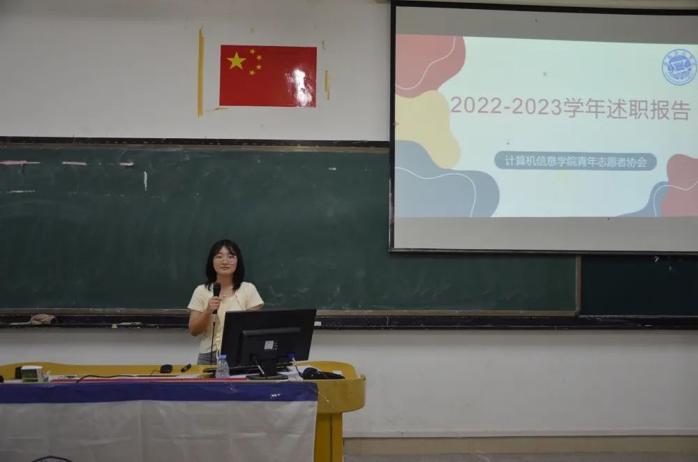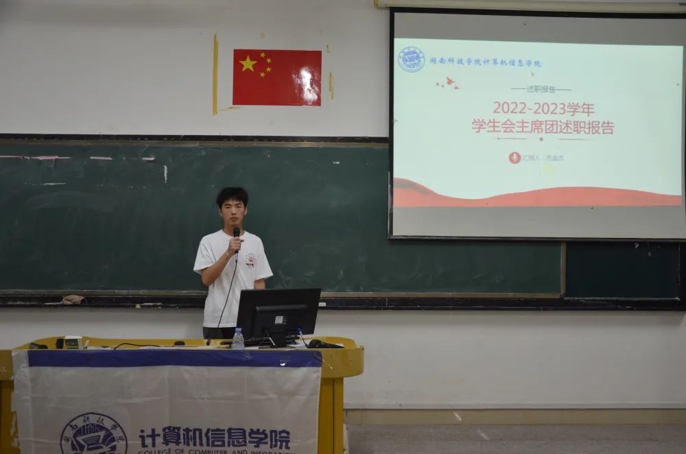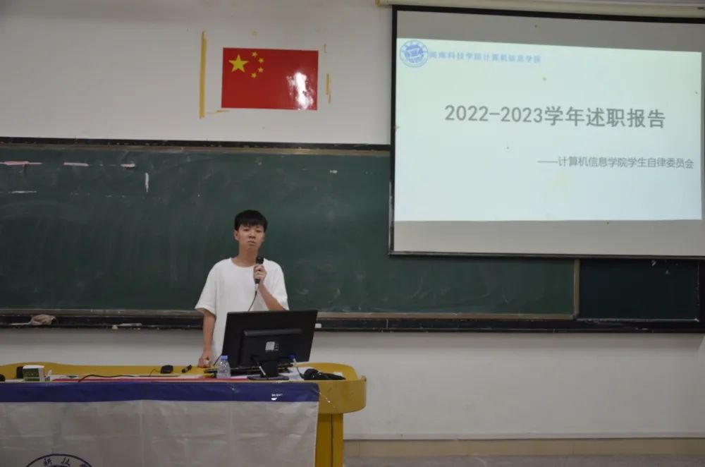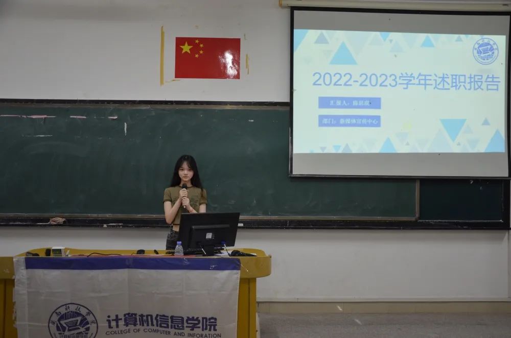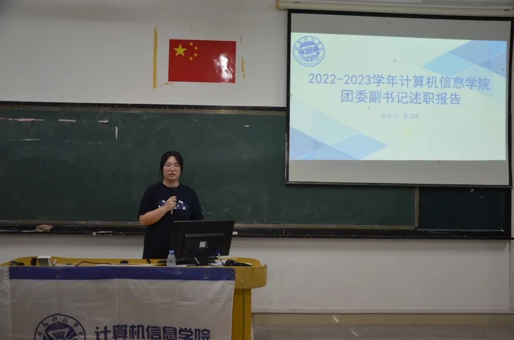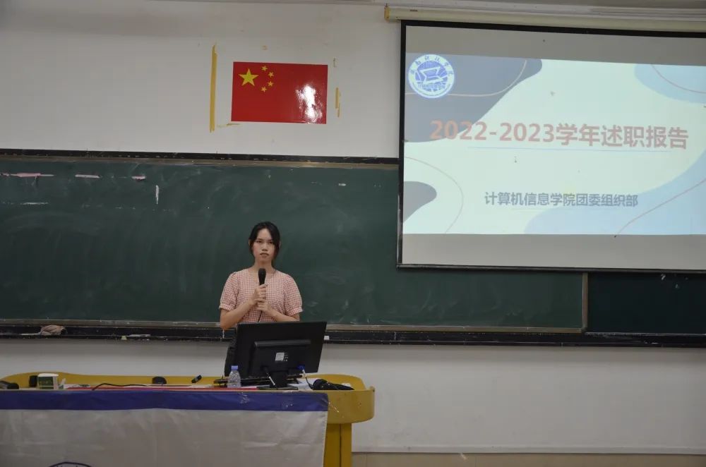 院团委副书记曾立萍、院员工会执行主席方金杰、院员工会主席团成员李泳荣、许海树以及院团学组织各部门负责人通过PPT从日常工作情况、活动开展情况、工作成效和缺点与不足等方面对本学期部门工作进行回顾总结,并深入查摆问题,同时激励新一届团学干部要在今后始终秉承“全心全意为同学服务”的宗旨,凝心聚力,履职尽责,继续发挥好桥梁纽带作用,努力成为计信学子“想得起、找得到、靠得住”的服务型团学组织。
