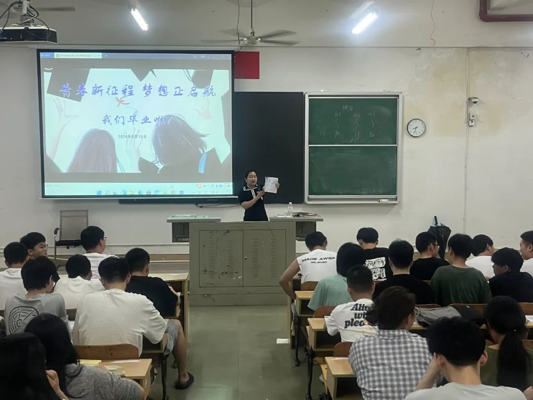 辅导员林旺涛、高惠慧围绕坚定理想信念、转变就业观念、诚信感恩、心理健康、安全教育、文明离校和注意事项等七个方面展开,引导毕业生要遵规守纪、牢固树立安全意识,做到文明离校、有序离校,自觉维护计信学子的良好形象,为自己的老员工活画上一个圆满的句号。辅导员要求同学们要保持积极乐观的心态,勇敢面对就业过程中的挑战和困难,不断提升自身的综合素质和专业技能,树立先就业再择业的观念;要始终把学习作为提升思想境界、锤炼道德品行、克服本领恐慌的人生利器,带着对未知的探索,对未来的憧憬,踏上新的学习之旅;要时刻牢记自己的责任和使命,以国家富强、民族振兴、人民幸福为己任,努力把人生梦想汇入时代洪流,在中国式现代化的伟大实践中实现个人价值的升华。