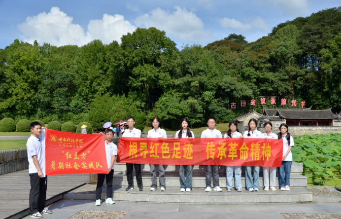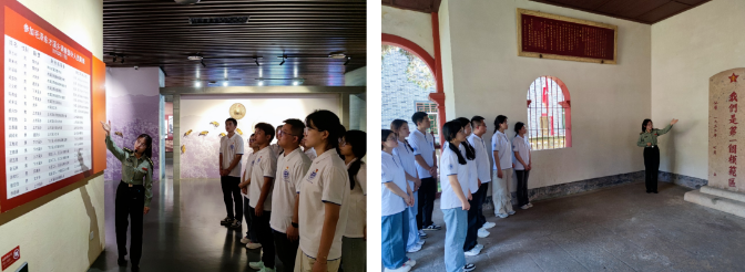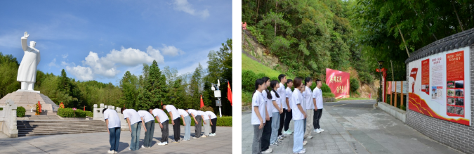 实践队沿着151级台阶拾步而上,来到位于会址东北侧的毛主席纪念园,瞻仰毛主席雕像,品读基座上篆刻的诗词,深切缅怀毛主席等老一辈无产阶级革命家的丰功伟绩和精神风范。随后,在松毛岭战役烈士纪念园,实践队认真聆听学习无名战士们不怕牺牲、血撒热土的英雄事迹,向烈士纪念碑默哀鞠躬,共同缅怀革命先烈。