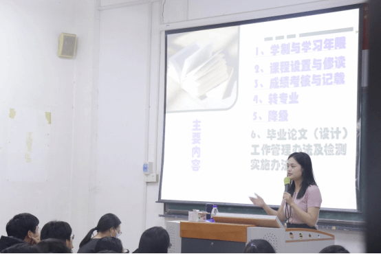 院教学秘书张丽娜向同学们介绍了考试、学籍等相关规定。各专业负责人从专业发展历程、人才培养模式、课程体系、专业建设成效、就业方向与前景等方面向同学们作了详细介绍,鼓励新生要不断充实专业知识,积极参加各类实习、实践和创新创业活动,增强实践能力与创新意识,为后期的职业发展打下坚实的基础。
